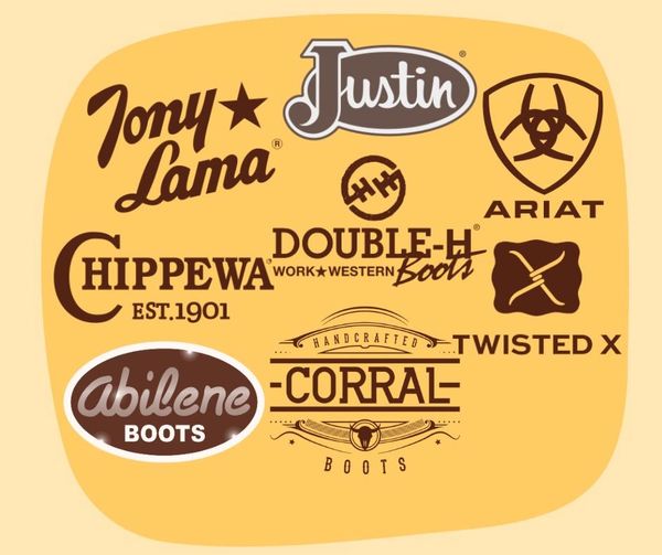 Brands include Justin, Ariat, Double H, Twisted X, Tony Lama, Corral, Georgia, Abilene, Roper, and more.